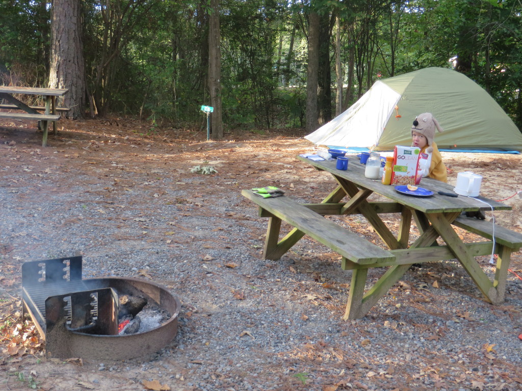 As part of helping mommy relax and just for the fun of it, Kinsley and I went camping this weekend. Friday night got down to 36(F) which was a mite chilly. When we mentioned last Thursday about camping his first comments was “I’m not going to drop the hammer on my toe!” — which is what he had done last year while camping and had a black toe nail for a couple of weeks afterwards. He was true to his word about not dropping it on his toe, but did manage to catch the side of his finger with it and get a nasty ouch. For the amount of time he spent playing with that hammer, though, he came out remarkably unscathed.